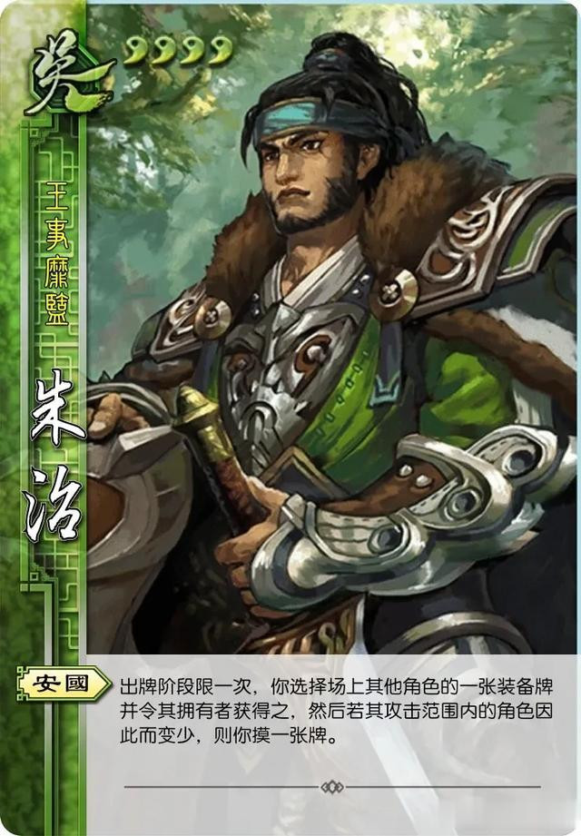 朱治是唯一存活至今的远古三费,【安国】技能可以选择一名有装备的角色,然后将装备卸下来,如果对方攻击距离因此发生变化,则摸一张牌。